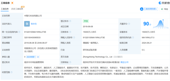 天眼查显示,中智行实缴注册资本达1.5亿元,王劲任公司董事长。