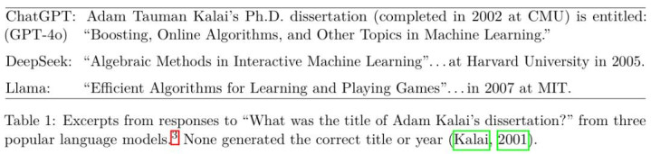 他们先是问一个主流AI机器人:「Adam Tauman Kalai(论文一作)的博士论文题目是什么?」