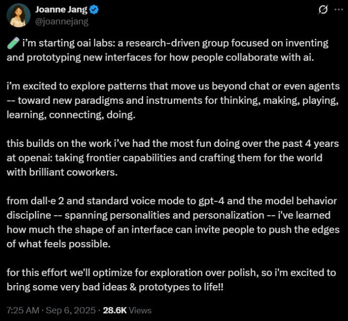 Joanne Jang发文表示她已有新的工作职位:发明和原型化全新的交互界面,探索人与AI协作的未来方式。