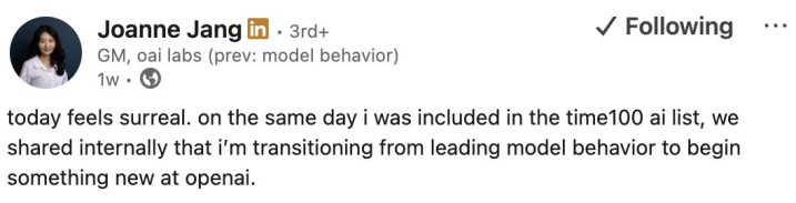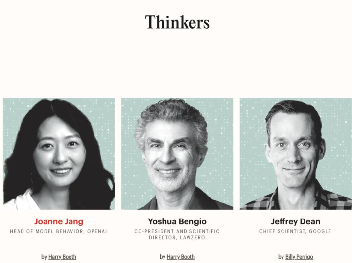 上周,作为Model Behavior团队负责人的Joanne Jang,登上《时代》百大AI人物榜单的「思想家」(Time AI 100 Thinkers),超越图灵奖得主、深度学习三巨头之一的Yoshua Bengio、谷歌首席科学家Jeffrey Dean等大佬。